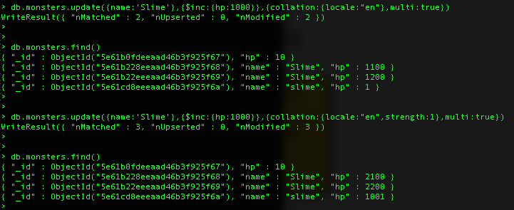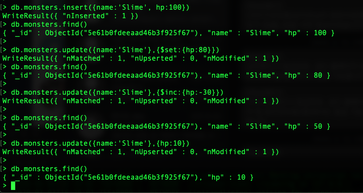 update: { $inc: { att: 1000 } ,$set :{"name":"Dragon","hp":4000,"att":1000}},