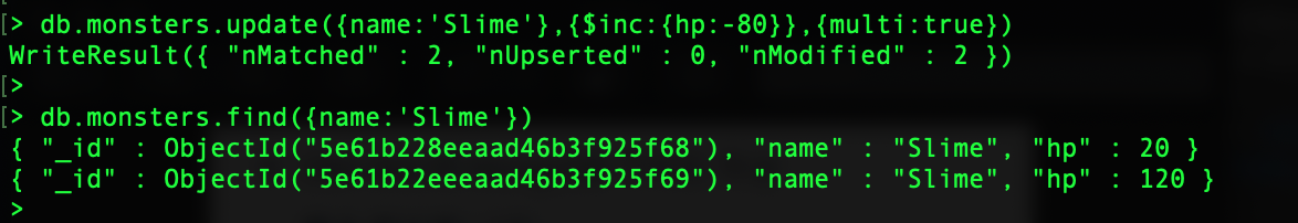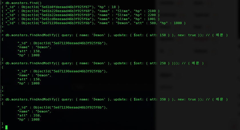 db.monsters.findAndModify({ query: { name: 'Demon' }, update: { $set: { att: 350 } }, new: true })